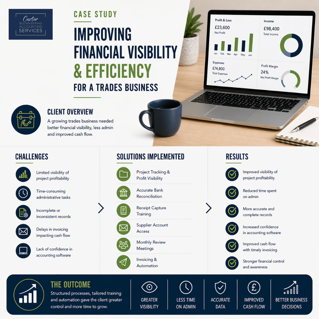 A growing trades business required support to better manage its finances, reduce administrative workload, and gain clearer insights into project profitability. The client was experiencing challenges with tracking income and expenses accurately, managing paperwork, and staying on top of invoicing and cash flow.
